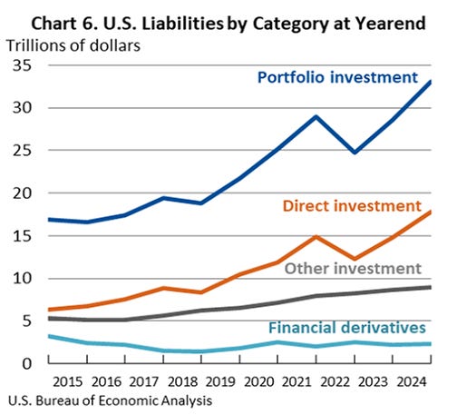 The NIIP has several categories, and Figure 2 illustrates the breakdown. The largest, by far, is “Portfolio Investment.” Simply put, this refers to foreigners purchasing our stocks and bonds. This makes sense, as our stock market was undervalued following the GFC in 2009. We also have the deepest and most liquid capital markets in the world. But why has this exploded since the GFC? The United States' propensity to overconsume is one answer. A second answer is the strength of our companies, specifically in the technology sector. A further piece of the puzzle lies in the vast amount of debt that now exists worldwide and the incredible network effect of the US dollar. Like it or not, we live in the age of debt, and our financial system is now much more of a debt-based monetary system. And at the center of this system lies the US dollar and the US Treasury bond market.